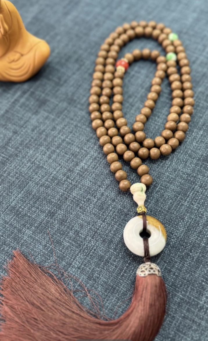 单珠制成后,根据需求,搭配翡翠平安扣、隔珠及其他饰品,编织成串,底部加上丝线流苏。仔细把玩,纯朴中透着大雅气韵。挂在车内、室内,或者佩戴把玩都有一种与众不同的感觉。