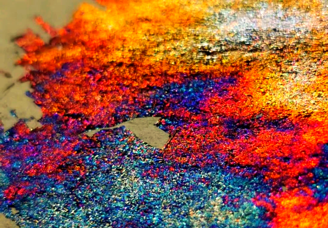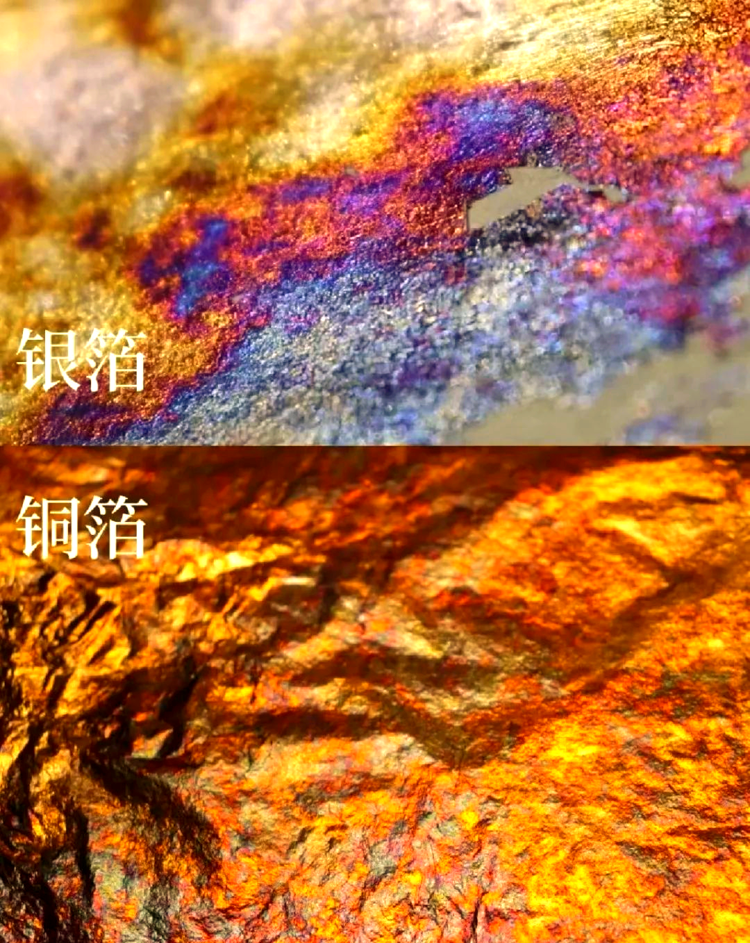 烧箔画以金箔、银箔、铜箔、铝箔等金属箔片为主要创作材料,这些金属箔片的厚度均不超过02毫米,展现出极高的延展性和可塑性。在烧箔过程中,银箔与铜箔会与硫磺等反应材料产生化学反应,从而生成色彩斑斓的效果。