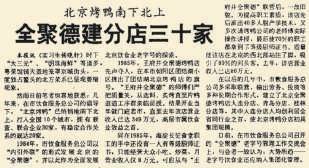 1984年,市饮食服务总公司以“内引外联”的形式发展老字号全聚德,并以此作为全面发展北京饮食业老字号的探索。1985年,王府井全聚德烤鸭店在朝阳区团结湖小区打出了团结湖北京烤鸭店的旗号,王府井全聚德的师傅们严把质量关,从选料、炙烤直至片鸭道道工序都亲临面授,开业当年便门庭若市,到1990年,该店营业收入达到349万元,高居市属饮食业效益之首。(1991年9月20日《北京日报》1版,《全聚德建分店三十家》)1993年,中国北京全聚德集团成立后,着手重新审核认证国内50余家挂全聚德牌匾的联营企业,逐步建立全聚德特许经营权制度,并把建立原材料、加工基地和配送中心作为首要任务,为实现工厂化生产和连锁规模化经营打下基础。(1993年9月13日《北京日报》2版,《全聚德烤鸭“飞”到哪都是原味》)