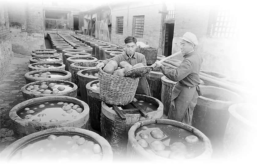 1955年,实行公私合营后,六必居的工人制作酱菜。李晞摄