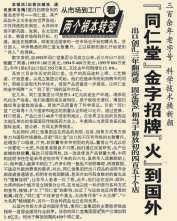 老字号同仁堂“火”到了国外。1992年,同仁堂集团公司成立,此后,集团公司投资3.4亿元改造生产环境,增添现代化生产设备,包括高压液相仪、原子吸收光谱仪、薄层扫描仪等全套检测设备,令产品质量有了科学保证。与此同时,同仁堂集团还在药品的剂型、包装、销售方式等方面努力与国际市场接轨,不仅出口传统的丸散膏丹,还增加了口服液、片剂、软胶囊等多种剂型的药品。以前,藿香正气丸一次要吃一大把,外国患者服食不习惯,后来,技术人员通过反复研究,生产出浓缩的软胶囊,每次只需服两粒,这一改进使该产品的销量大增。截至1996年10月,同仁堂集团固定资产达到3.6亿元,相当于新中国成立初期的450个同仁堂。(1996年10月7日《北京日报》1版,《“同仁堂”金字招牌“火”到国外》)