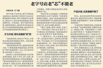 很多年轻人从冰激凌、口香糖里找到茶的感觉,认识了老字号吴裕泰。2009年,王府井的吴裕泰门店开始卖茶冰激凌。2010年下半年,前门大街、雍和宫等游客聚集区的门店也相继跟进。“夏天每天能卖四五百个,最多的时候卖1000多个,排队是常事,顾客多数是年轻人和小孩。”前门大街店售货员说,除了冰激凌,茶爽口香糖也是年轻人喜欢的热卖产品。“悠久+经典+现代+时尚,有两下子……我们看到了现代北京老字号”“古老的店,现代的味道”……网友的评论,彰显着对老字号“新潮”的欢迎。(2011年8月20日《北京日报》6版,《老字号店老“芯”不能老》)