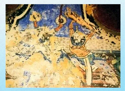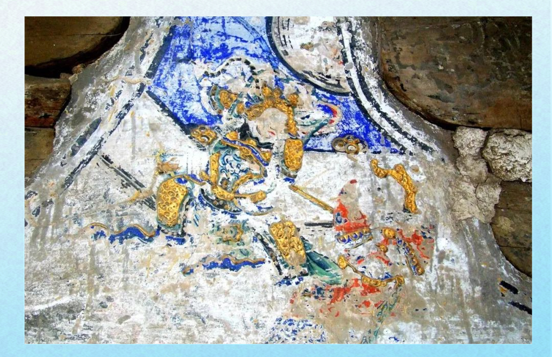 从壁画画面上可见,其绘制技艺独特,采用了沥粉镀金的方法。民间画工利用鸡的脲泡作为工具,将其洗净后装上特制的涂料底,通过挤压出均匀的线条,待线条干燥后再镀上金粉。这种精湛的技艺,使得壁画在部分画面脱落后,仍能留下金色的轮廓线条,仿佛在诉说着它曾经的辉煌。